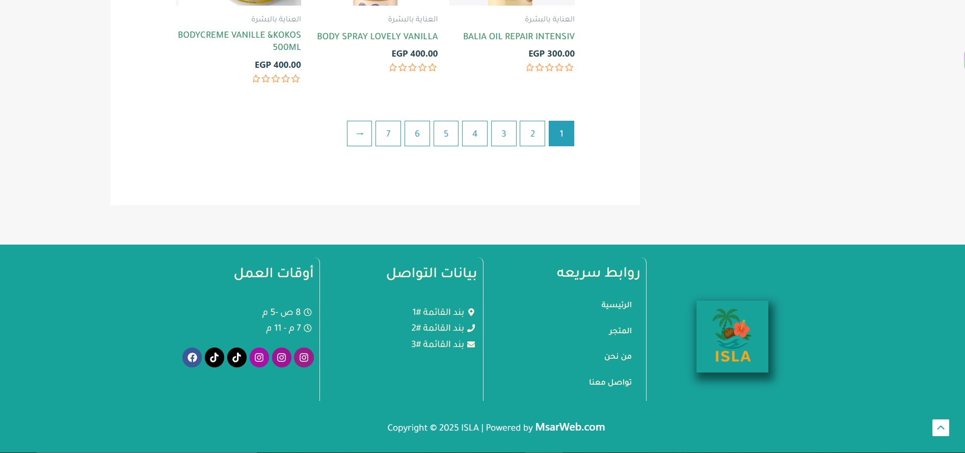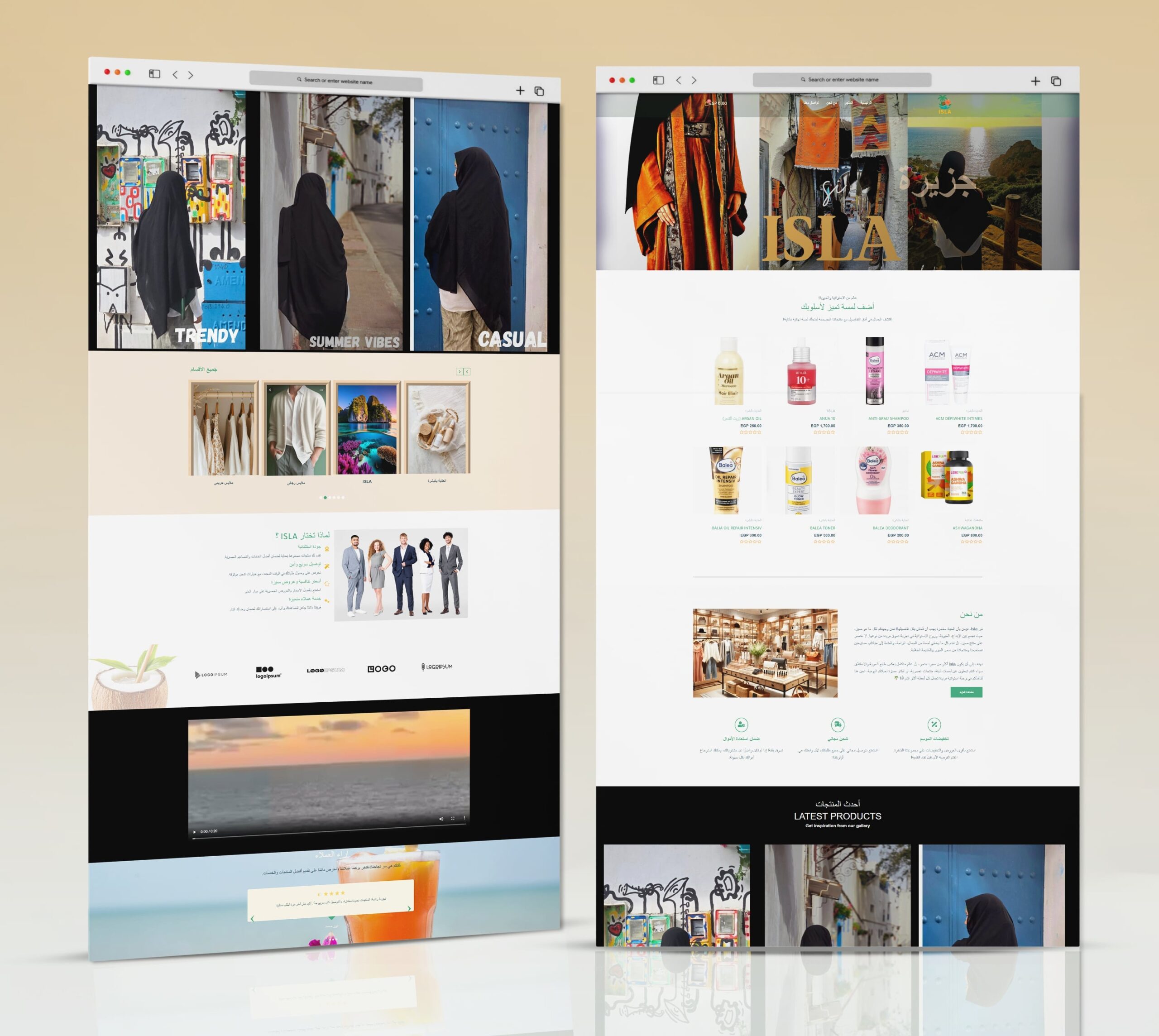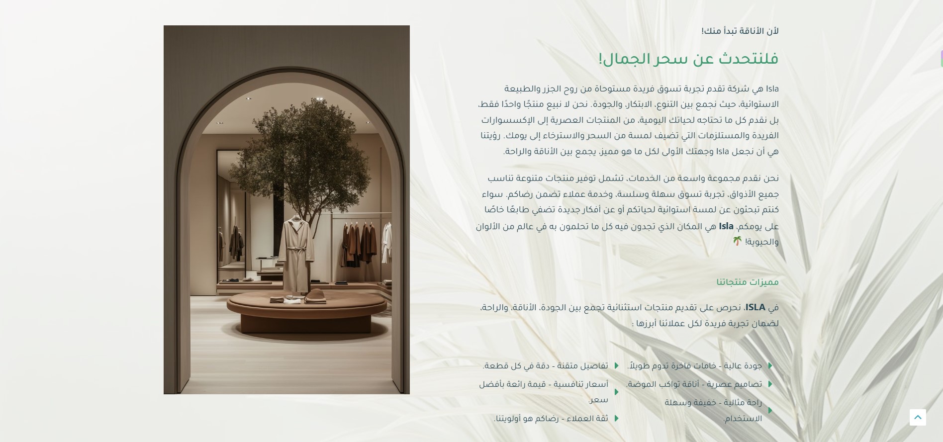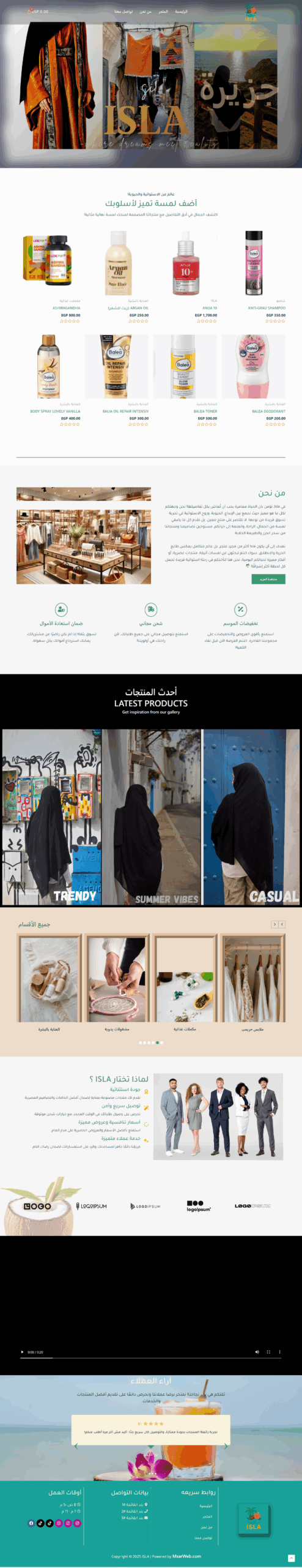 The Isla website features an elegant design inspired by tropical nature, where vibrant colors harmonize with simplicity to create a comfortable and attractive visual experience. The main pages include: Home, Shop, About Us, and Contact Us, making navigation organized and easily accessible. The user experience is smooth, clearly showcasing the brand’s identity while highlighting its products in a modern style that reflects quality and innovation.