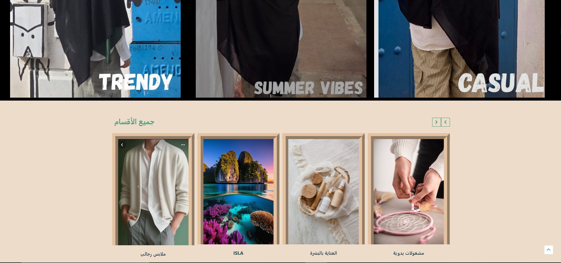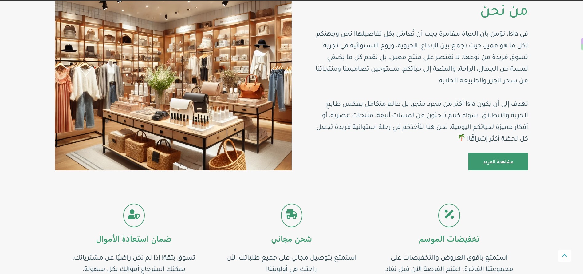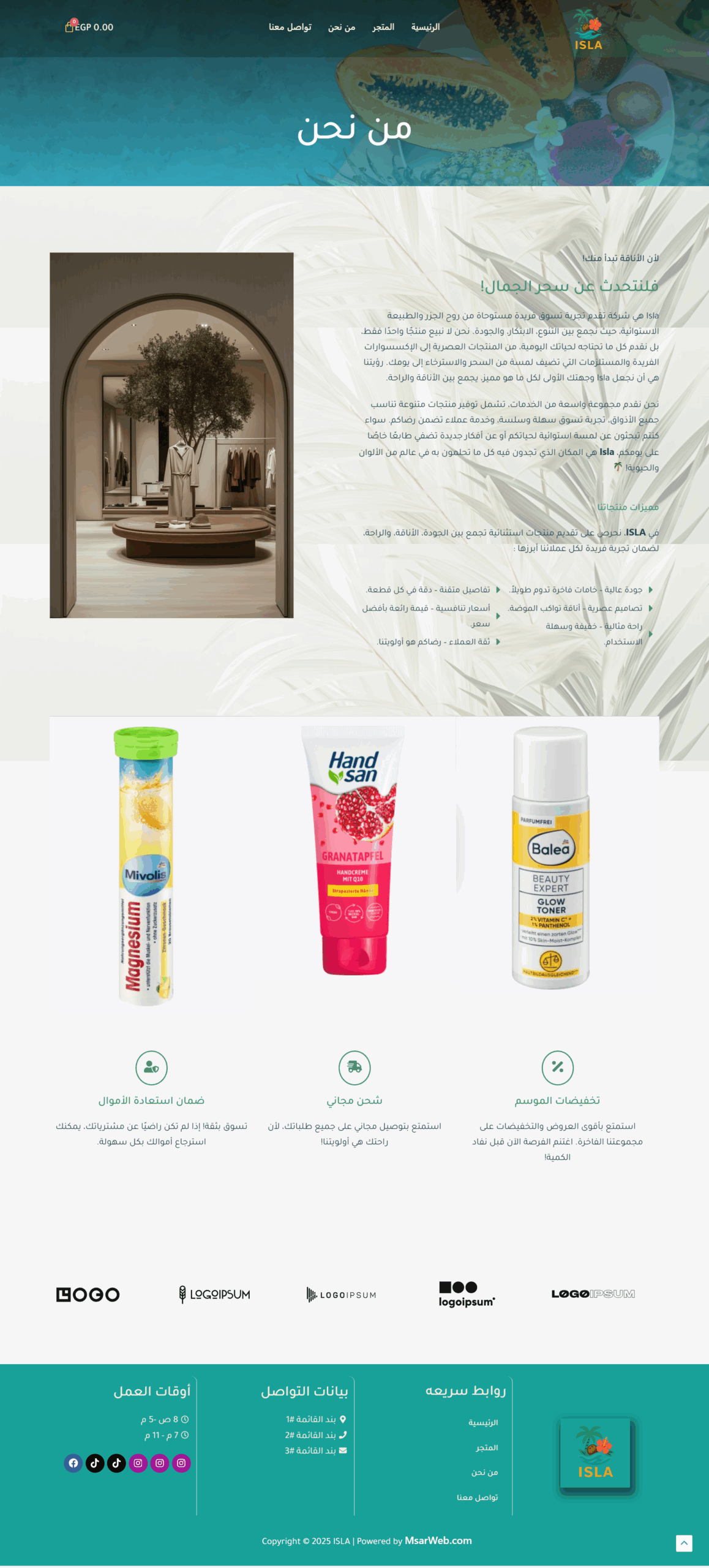 The Isla website features an elegant design inspired by tropical nature, where vibrant colors harmonize with simplicity to create a comfortable and attractive visual experience. The main pages include: Home, Shop, About Us, and Contact Us, making navigation organized and easily accessible. The user experience is smooth, clearly showcasing the brand’s identity while highlighting its products in a modern style that reflects quality and innovation.