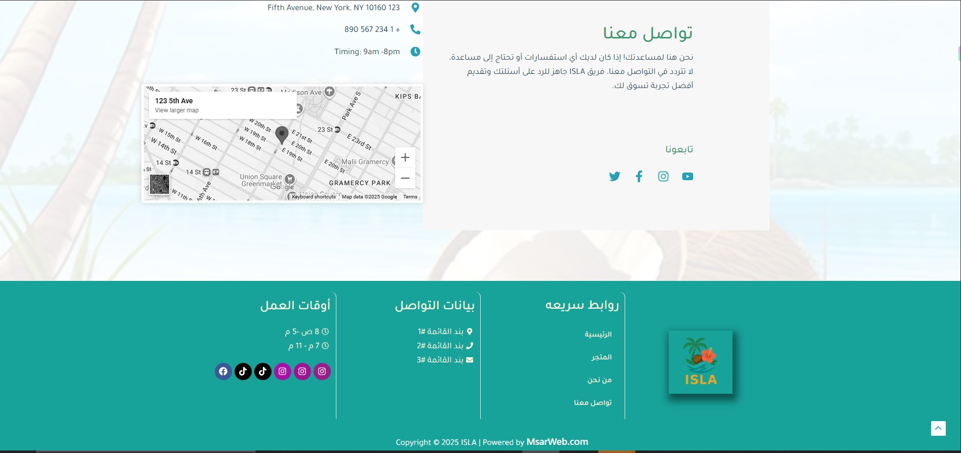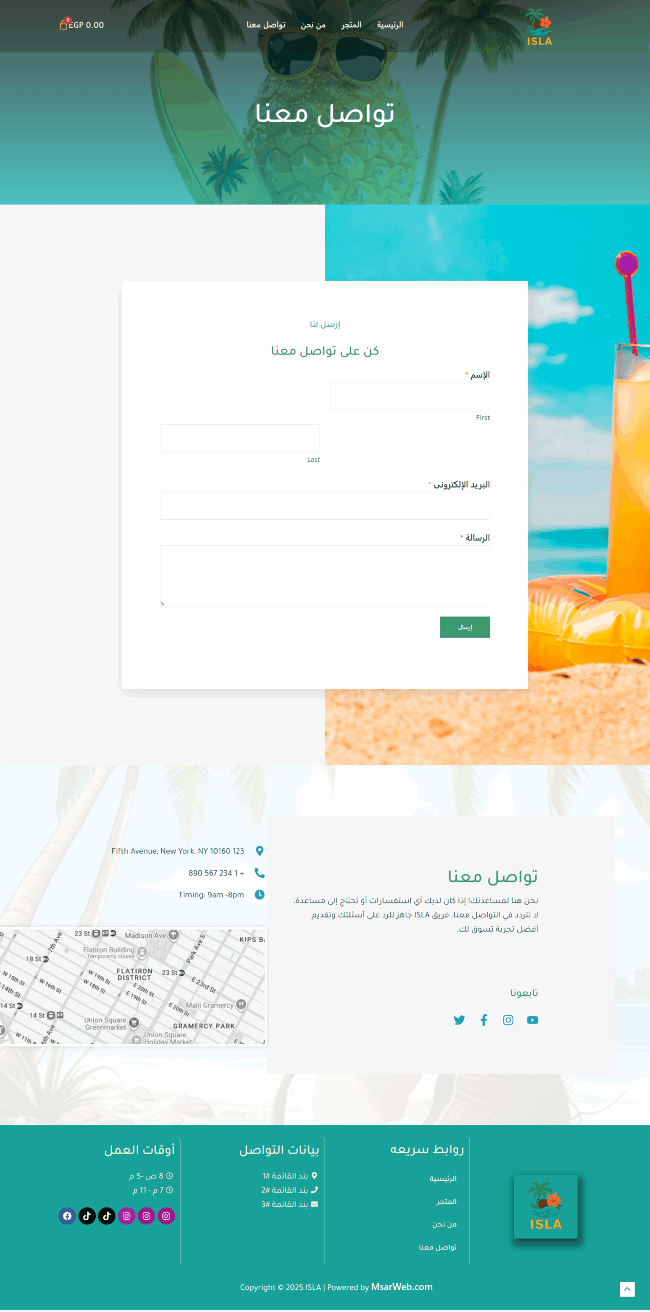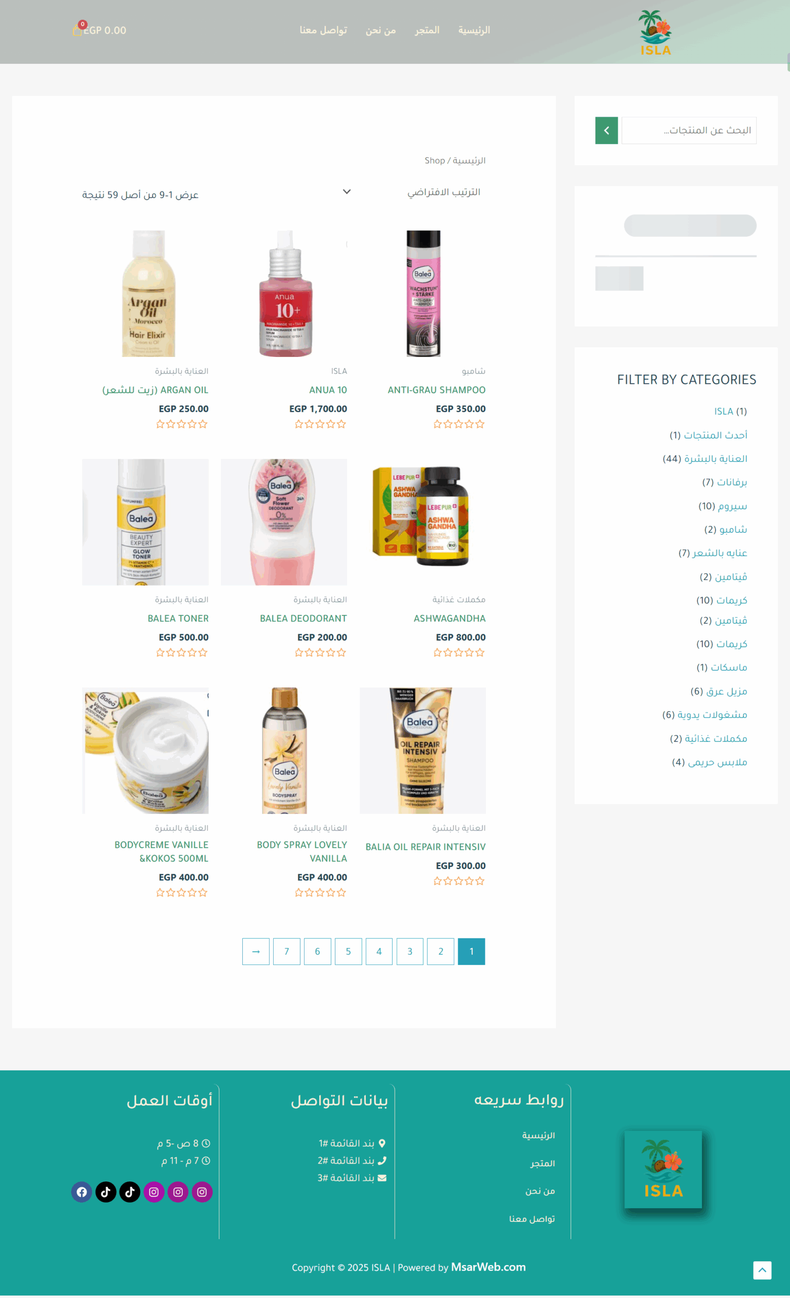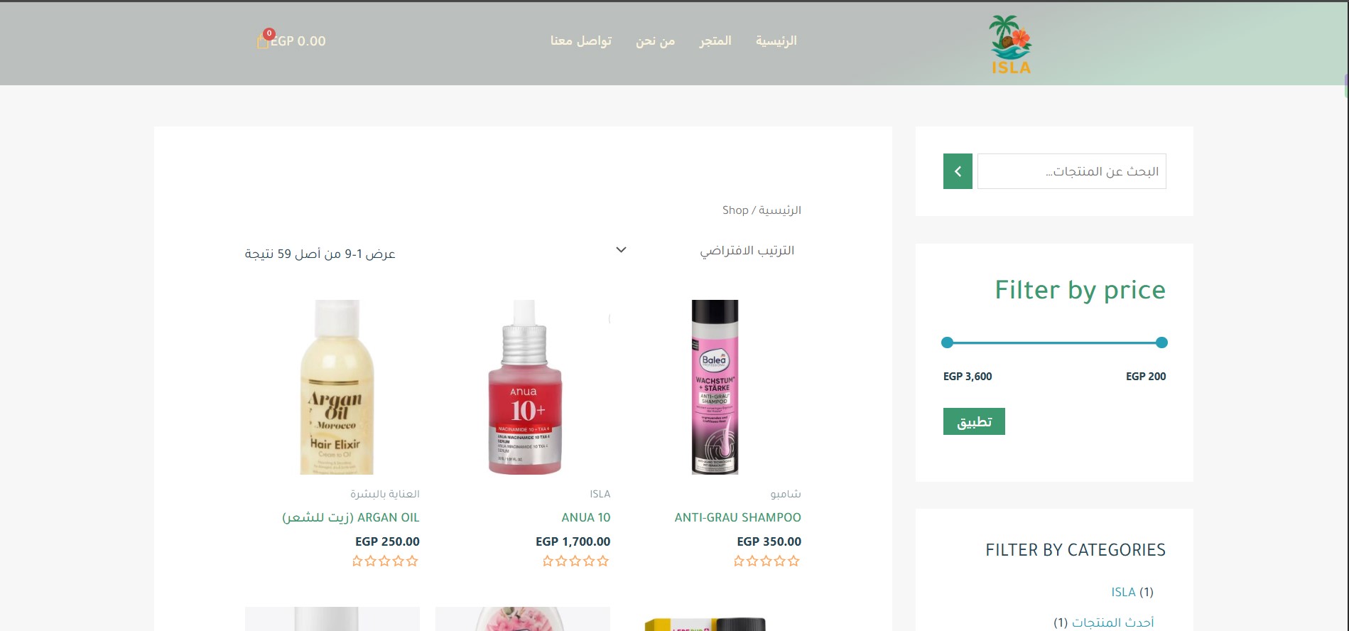 The Isla website features an elegant design inspired by tropical nature, where vibrant colors harmonize with simplicity to create a comfortable and attractive visual experience. The main pages include: Home, Shop, About Us, and Contact Us, making navigation organized and easily accessible. The user experience is smooth, clearly showcasing the brand’s identity while highlighting its products in a modern style that reflects quality and innovation.
