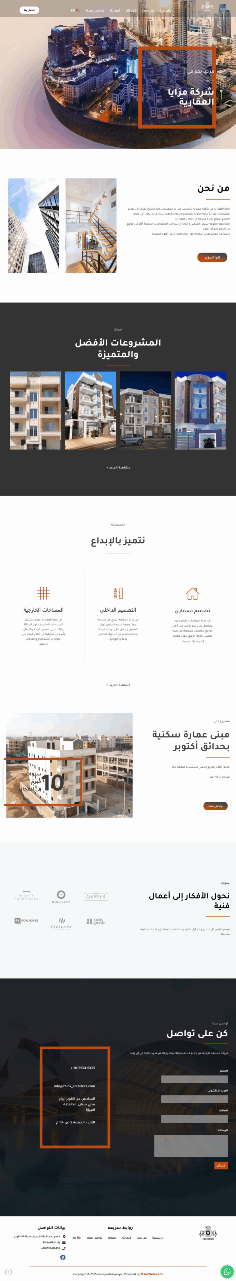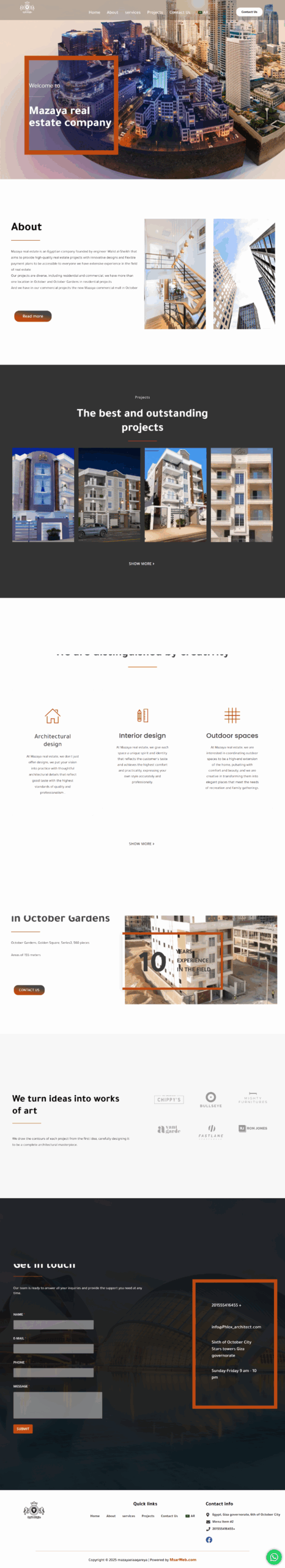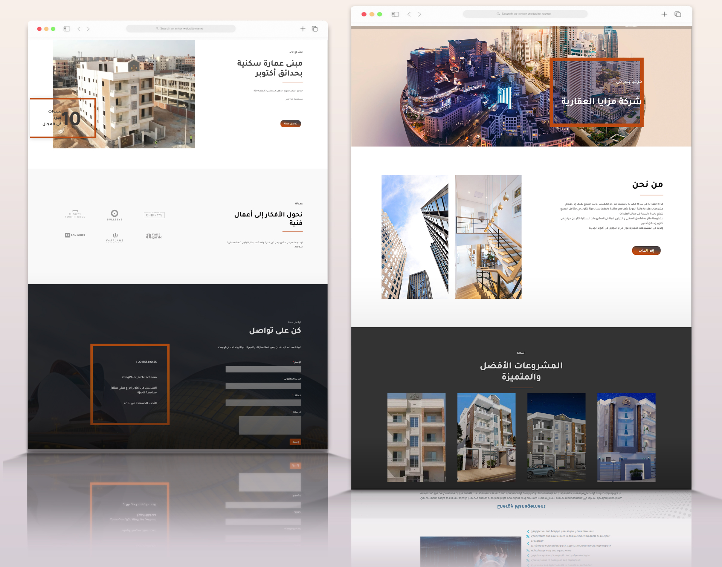 Mazaya Real Estate website features a modern and elegant design that combines simplicity with professionalism, offering visitors a smooth and enjoyable browsing experience. It is available in both Arabic and English to serve a wide range of clients and provide seamless access to information. The site includes clear sections such as About Us, Services, Projects, and Contact Us, making it easy to explore everything the company offers. High-quality project images highlight the brand’s strength and enhance customer trust.