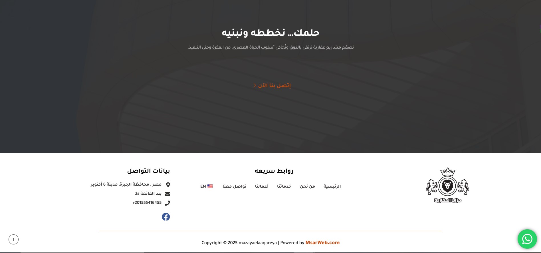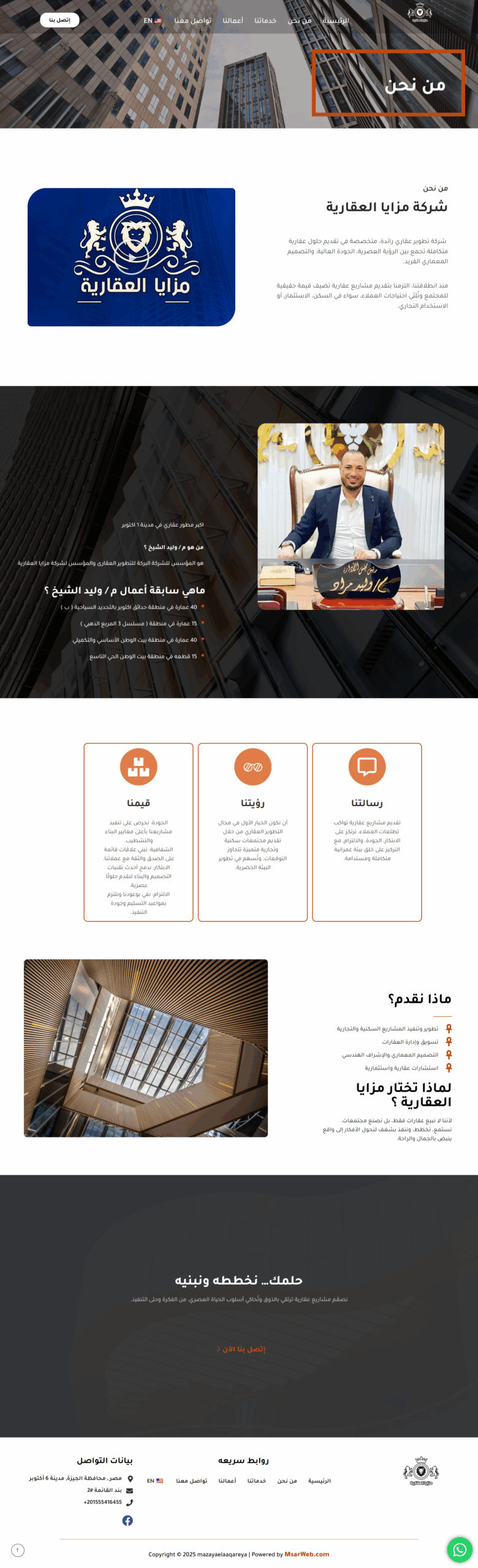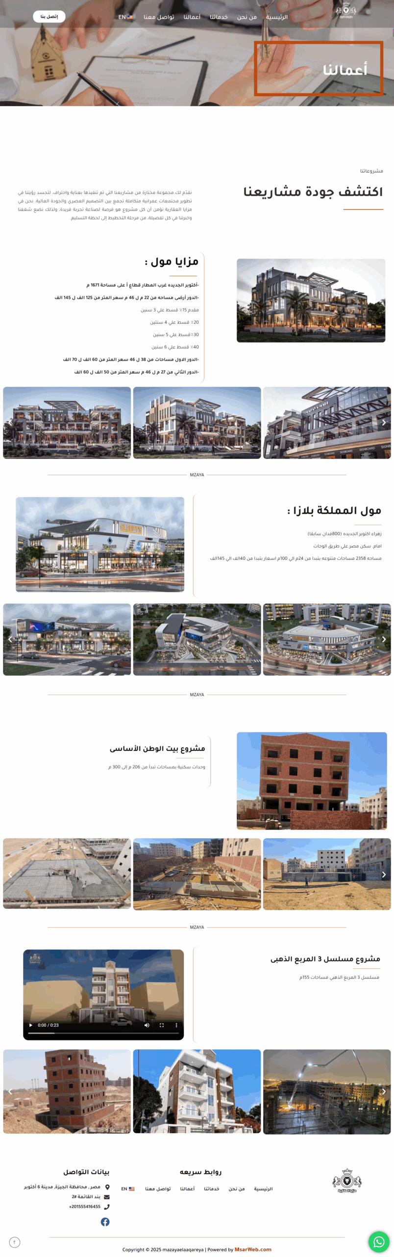 Mazaya Real Estate website features a modern and elegant design that combines simplicity with professionalism, offering visitors a smooth and enjoyable browsing experience. It is available in both Arabic and English to serve a wide range of clients and provide seamless access to information. The site includes clear sections such as About Us, Services, Projects, and Contact Us, making it easy to explore everything the company offers. High-quality project images highlight the brand’s strength and enhance customer trust.