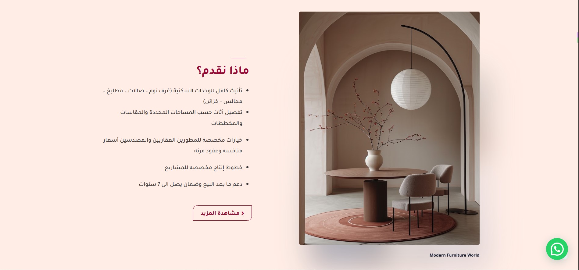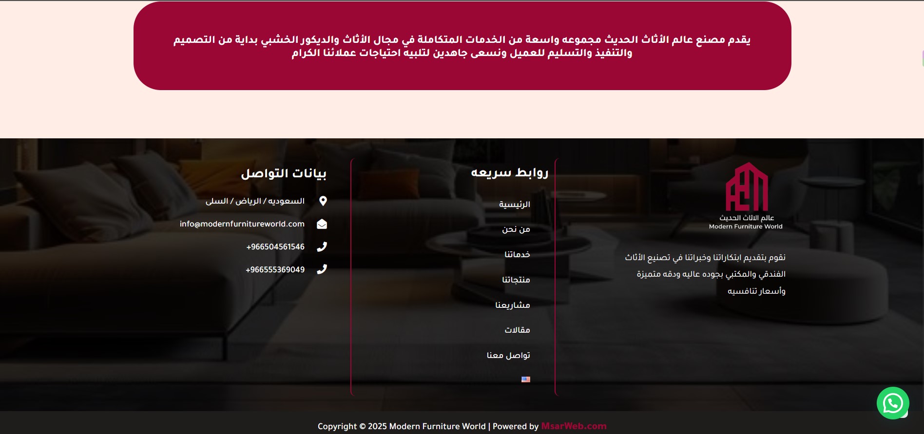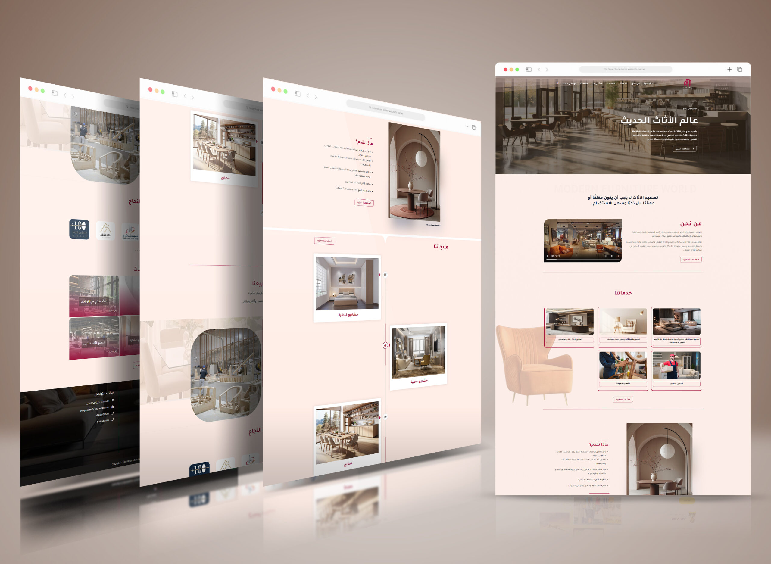 The Modern Furniture World website features an elegant design that reflects luxury and professionalism in the world of furniture and interior design. The main pages include: Home, About Us, Services, Products, Projects, Articles, and Contact Us, making navigation organized and simple. The user experience is smooth, allowing visitors to clearly discover the company’s identity and services, while showcasing projects and products in a modern style that emphasizes quality and precision. Additionally, the Contact page is designed to make it easy for customers to reach out and build trust with the brand.